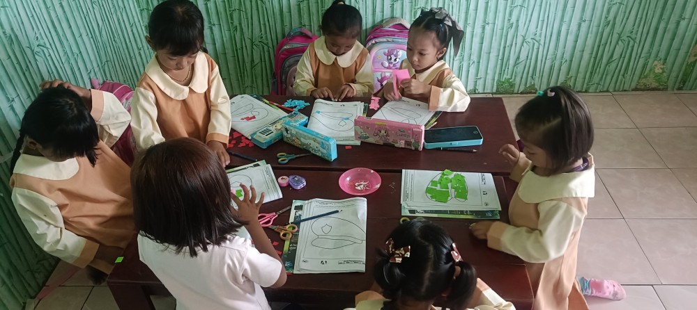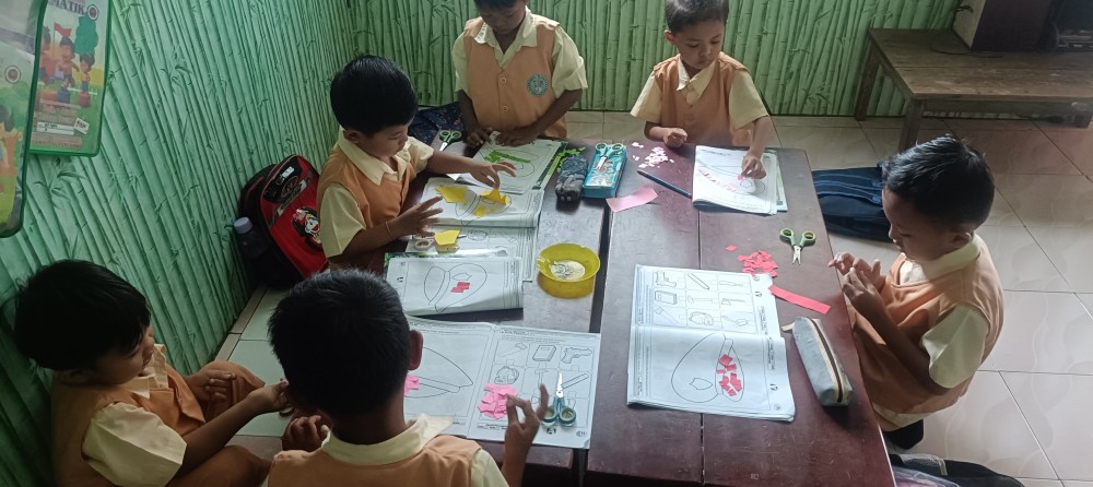 Kegiatan belajar kreatif dilakukan oleh siswa Kelompok A TK Dharma Wanita Desa Pandansari dengan membuat kolase dari kertas origami bertema profesi, yaitu gambar topi polisi. Suasana kelas terlihat penuh semangat saat anak-anak mulai menyusun potongan kertas menjadi karya yang menarik dan berwarna.